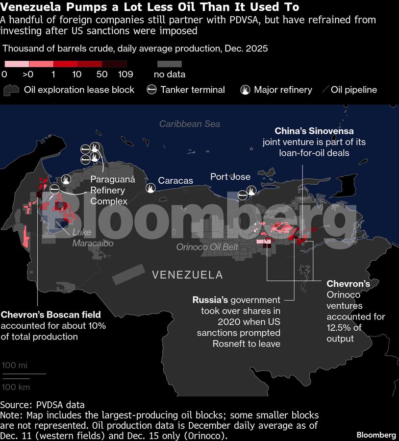 Η Βενεζουέλα διαθέτει τα μεγαλύτερα αποδεδειγμένα αποθέματα πετρελαίου παγκοσμίως, ωστόσο η παραγωγή της έχει υποχωρήσει κάτω από το 1 εκατ. βαρέλια ημερησίως, έπειτα από δεκαετίες υποεπένδυσης, εμπορικών κυρώσεων και οικονομικής απομόνωσης.