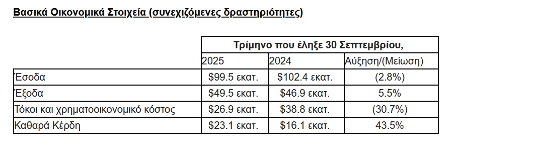 Το χρηματοοικονομικό κόστος μειώθηκε σημαντικά κατά 30,7%, στα $26,9 εκατ., γεγονός που συνέβαλε καθοριστικά στη βελτίωση της καθαρής κερδοφορίας.