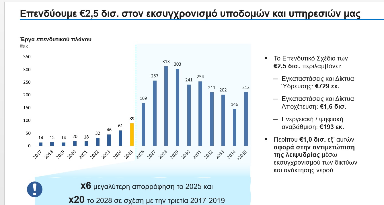 Μέχρι το 2034 οι επενδύσεις της ΕΥΔΑΠ φτάνουν τα 2,5 δισ. και για να πραγματοποιηθούν απαιτούν επιτάχυνση των ετήσιων επενδύσεων από το 2026