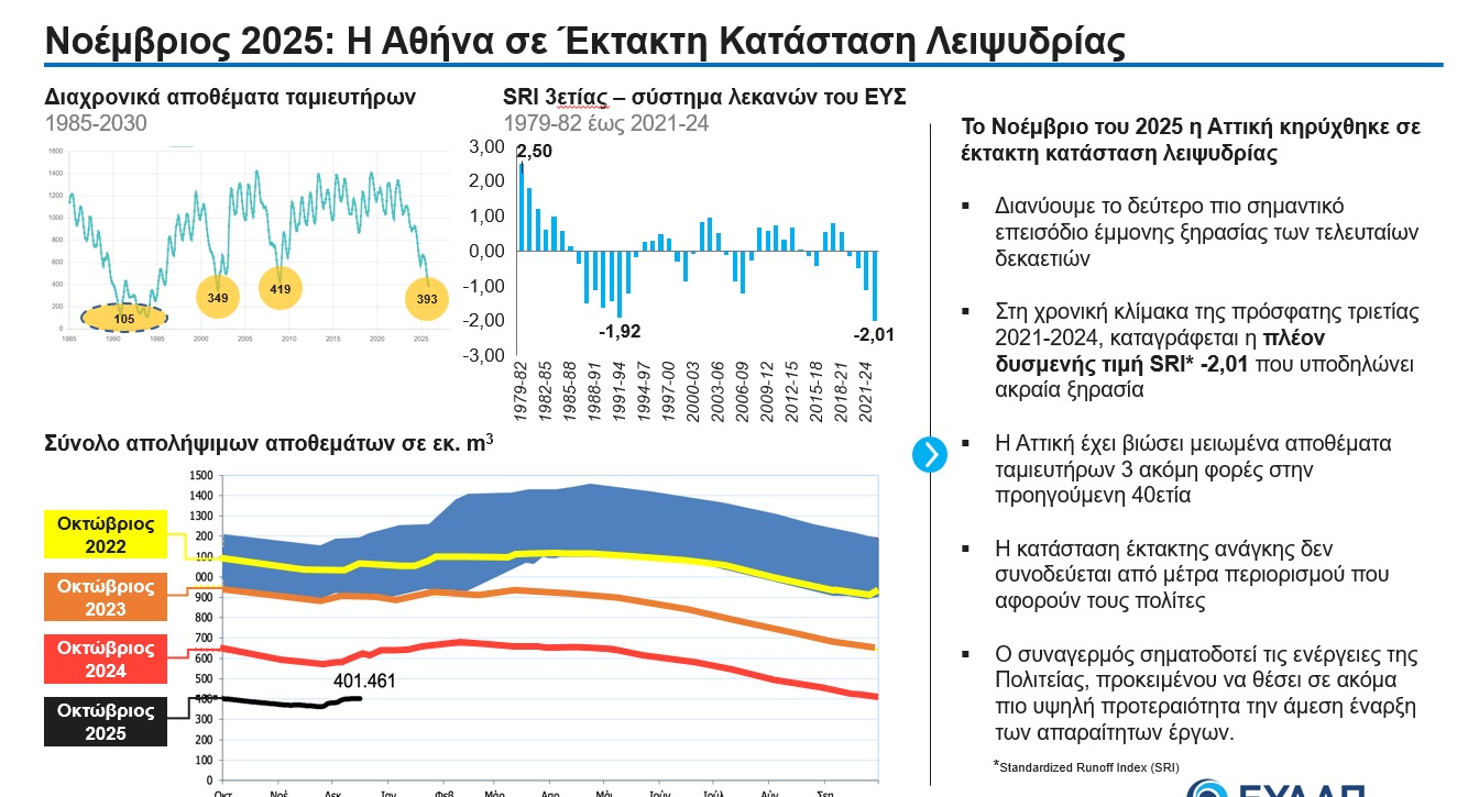 Η εταιρεία τόνισε, ότι παρά τις πρόσφατες βροχοπτώσεις, δεν αλλάζει ότι η Αττική βρίσκεται αντιμέτωπη με μία από τις σοβαρότερες προκλήσεις των τελευταίων δεκαετιών στον τομέα των υδατικών πόρων, καθώς τον Νοέμβριο του 2025 κηρύχθηκε επίσημα σε κατάσταση έκτακτης ανάγκης λόγω λειψυδρίας. Πρόκειται για το δεύτερο πιο έντονο επεισόδιο έμμονης ξηρασίας που έχει καταγραφεί τις τελευταίες δεκαετίες, με τα δεδομένα της τριετίας 2021-2024 να αποτυπώνουν την πλέον δυσμενή τιμή του δείκτη SRI (-2,01), ένδειξη ακραίων υδρολογικών συνθηκών.