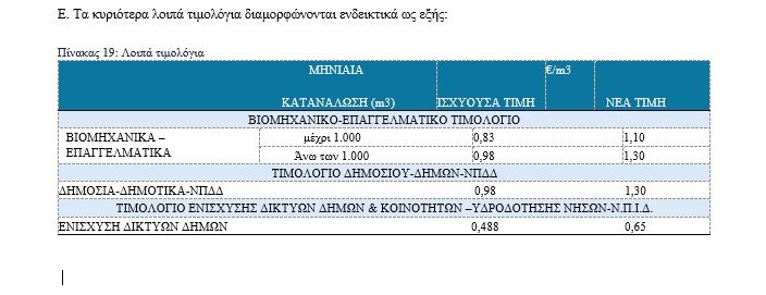 Για τις επαγγελματικές, βιομηχανικές και δημόσιες χρήσεις, προβλέπονται ενδεικτικές αναπροσαρμογές στις χρεώσεις ανά κυβικό μέτρο, οι οποίες συνδέονται με την ανάγκη ανάκτησης κόστους και χρηματοδότησης των νέων υποδομών, χωρίς ωστόσο να μεταβάλλεται η βασική αρχή της ανταποδοτικότητας και της διαφάνειας.