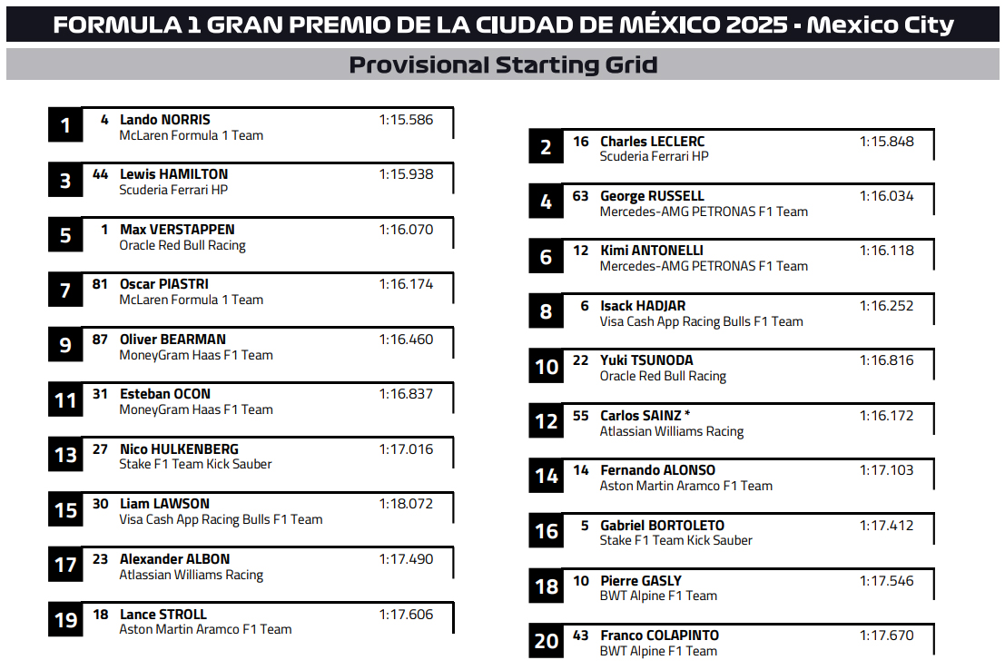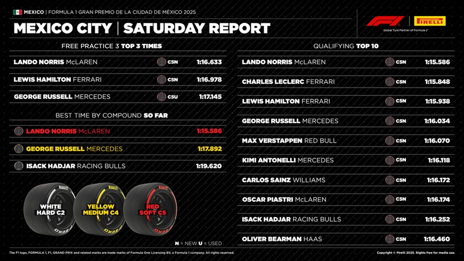 Άγρια ομορφιά έχει πάρει το πρωτάθλημα οδηγών, το οποίο διεκδικούν 3: Ο Λάντο Νόρις (332β.) που σημείωσε την 14η pole της καριέρας του, ο Φερστάπεν (306β.) που κατετάγη 5ος και ο πρωτοπόρος της βαθμολογίας Όσκαρ Πιάστρι (346β.) που κατετάγη 7ος. Ο Λάντο Νόρις θα εκκινήσει το σημερινό Grand Prix στην πίστα Autódromo Hermanos Rodríguez από την pole position, χάρη στον ταχύτερο γύρο στο Q3 με χρόνο 1:15.586. Επίδοση που έγινε με μέση ωριαία ταχύτητα 205km/h και αποτελεί νέο ρεκόρ πίστας. Είναι η πέμπτη pole του οδηγού της McLaren φέτος και η πρώτη του στο Μεξικό.