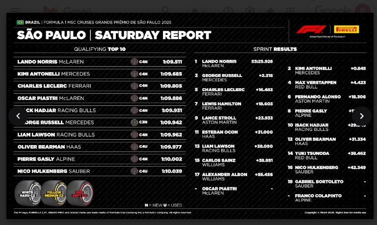 Ο Πιάστρι εκκινεί από την 4η θέση και μετά την εγκατάλειψή του στο χθεσινό αγώνα Sprint βρίσκεται σε δύσκολη θέση καθώς ο Νόρις που κέρδισε στο Sprint έχει διαφορά 9 βαθμών. Χτες βράδυ μετά τη νίκη του στο Sprint, ο Νόρις κατέκτησε τη δεύτερη pole position του Σαββατοκύριακου στη Βραζιλία, αφού βρέθηκε επικεφαλής και στις τρεις περιόδους των κατατακτήριων δοκιμών αυτό το απόγευμα. Ο Πιάστρι θα πρέπει να περάσει τους Λεκλέρκ και Αντονέλι αν μπορεί, προτού διεκδικήσει κάτι παραπάνω από το Νόρις. Ο Αυστραλός οδηγός είναι ντεφορμέ και με κακή ψυχολογία οπότε μια θετική εμφάνιση είναι καθοριστική αν θέλει να μείνει με ρεαλιστικές ελπίδες στη μάχη του τίτλου. Πόσο μάλλον που αρκετές εικόνες δείχνουν πως ο Νόρις πάτησε σε νερά (επίτηδες;) τα οποία προκάλεσαν το γλίστρημα του Πιάστρι όπως και των Χούλκενμπεργκ, Κολαπίντο στο Sprint.