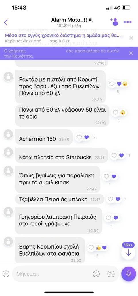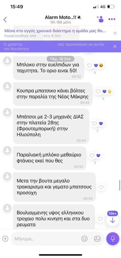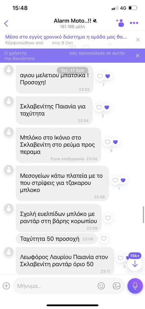 Σύμφωνα πληροφορίες, μάλιστα, οι αναρτήσεις των μελών της κοινότητας δεν περιορίζονταν στη δημοσιοποίηση των σημείων διενέργειας ελέγχων από την Τροχαία, αλλά περιλάμβαναν και ανακοινώσεις που αφορούσαν μέτρα εμφανούς αστυνόμευσης, καθιστώντας την ομάδα πηγή πληροφόρησης όχι μόνο για επίδοξους παραβάτες του Κώδικα Οδικής Κυκλοφορίας, αλλά και για πιθανούς παραβάτες του κοινού ποινικού δικαίου.