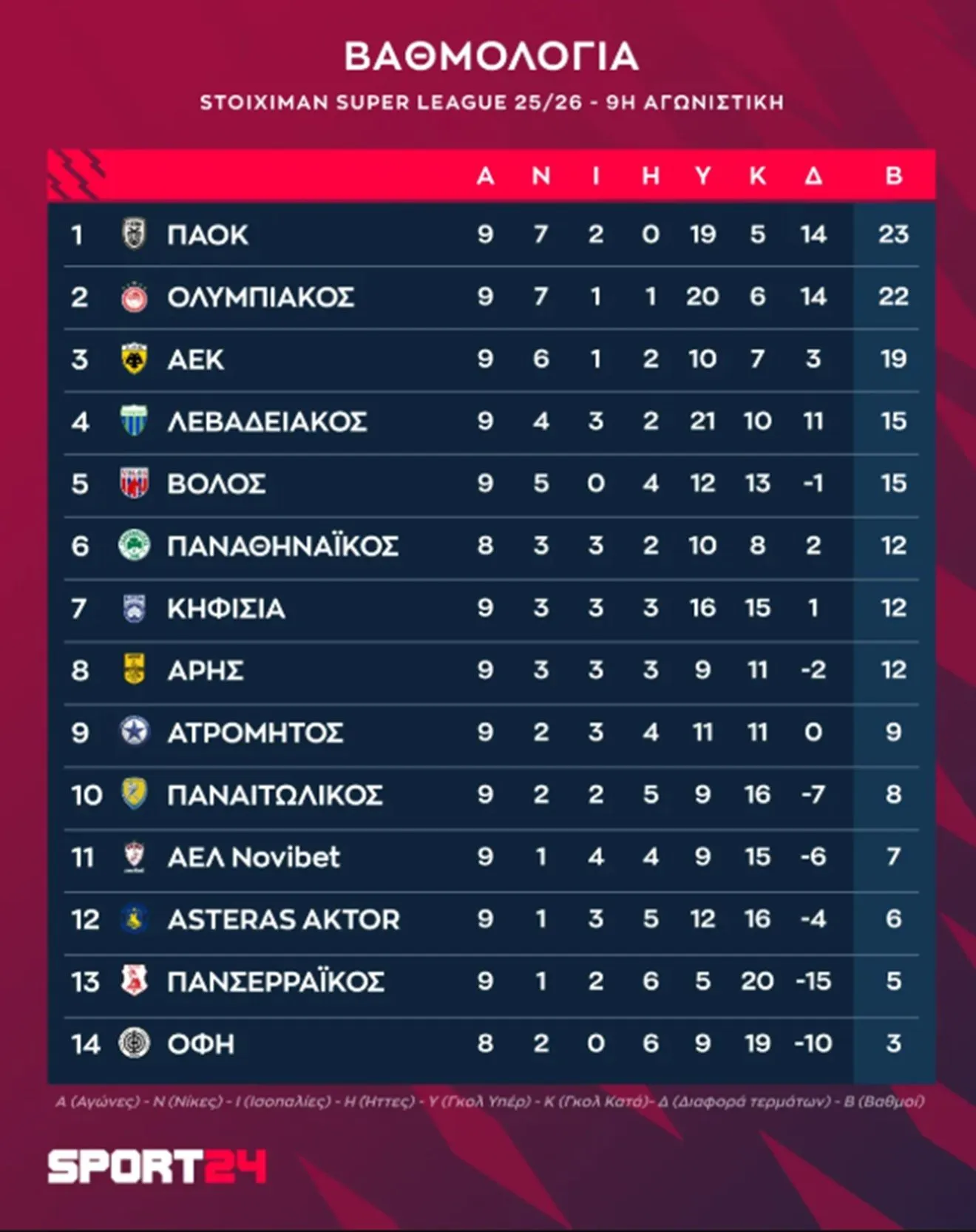 Μετά την ολοκλήρωση της 9ης “στροφής, στην κορυφή βρίσκεται ο ΠΑΟΚ με 23 βαθμούς, 2ος ο Ολυμπιακός με 23 και 3η η ΑΕΚ με 19.